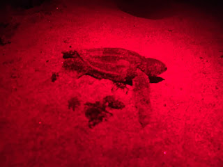 Poppy, Mandy, and I joined Tom, his family who are visiting and Sharka (one of the local staff), for the Night Survey at Levera. Tom went out on the first run with his Family and saw one female, whilst the rest of us rested at the beach hut. The second run was Sharka, Poppy and I and we saw 3 females! The first was emerging near the end of the beach so we carried on to the end and found another. We split into two and Sharka ran between Poppy and I whilst we got the information on the turtles. The female I was watching nested too close to the sea and past the beach markers so we had to relocate her eggs. This was my first relocation. They try not to relocate as much as possible as the success rate for relocated eggs is much lower than if they’re left where they are. The female spent ages digging her nest, a real perfectionist which seemed a shame because as soon as she was ready to lay we had to fill the hole and catch her eggs. The eggs were put in a bucket and once she was finished and measured we moved to a more suitable spot and dug our own nest. I was given the job of counting and putting the eggs into the make shift nest.
